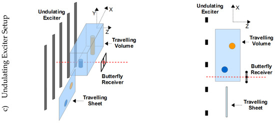 The 3D and the top view of three different kinds of planar MIT setups are shown. A sheet-like or a volumetric object travels in the x-direction through the arrangement. (a) Circular exciter setup; (b) vertical wire exciter setup; (c) undulating exciter (undulator) setup.