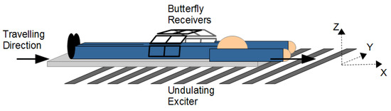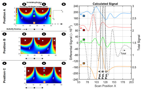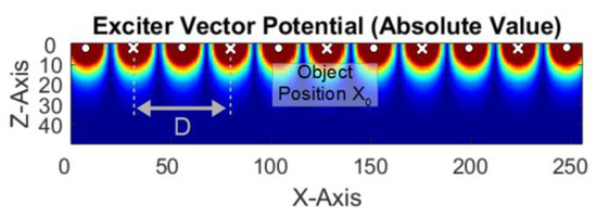 For the planar scanners (Figure 3), a different occurs for each x-position of the body inside the exciter vector potential , and must be individually computed ( as a function of midpoint x-position of the body =). This particular calculation creates a major contribution towards the overall computational effort. As a fortunate coincidence, an undulating exciter offers an efficient shortcut (Section 2.3.1) for the frequently required calculation of . The proportionality in Equation (1) is sufficient, since the relative amplitudes of the signals and differential signals are of particular interest in this article, not the absolute amplitudes.