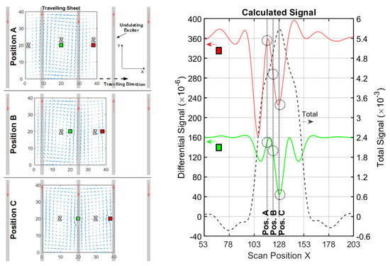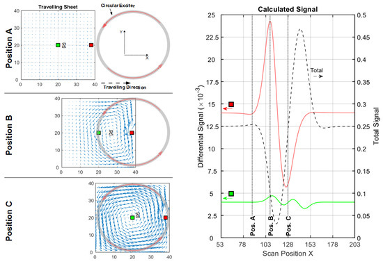 Current and signal calculations with a circular setup (cf. Figure 3a); (left) Travelling 2D sheet with local voids (green and red squares) in front of a circular exciter. Blue arrows depict the current direction and intensity. Only three significant x-positions (A, B and C) are shown; (right) Total (dotted black line) and differential signals for a void in the center (green line) and for a void at the edge (red line).