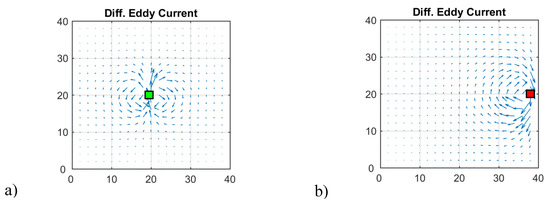 Figure 6 illustrates the shape of a differential eddy current density, i.e., the subtracted current field densities from a sheet with and without perturbation. Due to inhomogeneity in a homogeneous environment, the shape of the differential eddy current density approaches a dipole-like field (Figure 6a). However, the edge of the sheet distorts this field (Figure 6b). The two eddy current perturbations in the sheet generally appear in this shape, and only the intensity and/or the sign changes for the momentarily applied symmetry in the vertical direction.