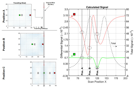 Current and signal calculations with a vertical wire setup (cf. Figure 3b); (left) Travelling 2D sheet with local voids (green and red) in front of a vertical wire. Blue arrows depict the current direction and intensity. Only three significant x-positions (A, B and C) are shown; (right) Total (dotted black) and differential signals for a void in the center (green) and for a void at the edge (red).