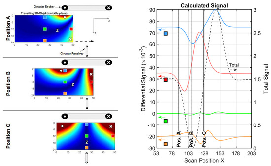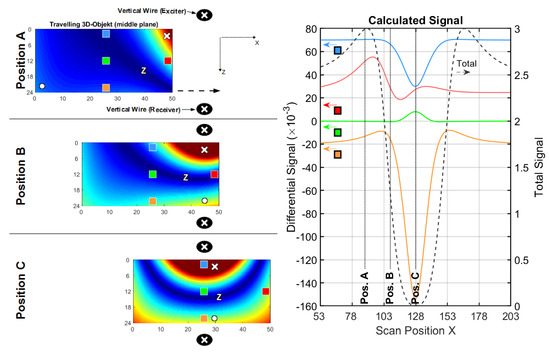Current and signal calculations with a vertical wire setup (cf. Figure 3b); (left) Eddy current density distribution in the horizontal middle plane of a conducting and travelling volume, shown at three positions A, B and C. Local voids at four characteristic positions inside the travelling volume (blue, green, orange and red squares) are analyzed; (right) Total signal (dotted black) and differential signals (blue, green, orange and red lines) for the four voids.