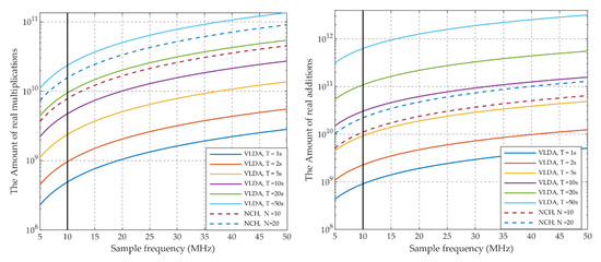 - It can be approximated that the calculation amount of the VLDA method (T = 10 s) is approximately the same as the NCH method (Nnch = 20). For example, the operations of VLDA method (T = 10 s) are 4.74 × 109 multiplication and 3.04 × 1010 addition if the sampling frequency is 10 MHz (black lines in the figures), while those of the NCH method (Nnch = 20) are 1.57 × 1010 multiplication and 2.21 × 1010 addition. The amount of multiplications is decreased by 1.10 × 1010, while that of additions are increased by 8.3 × 109. The amount of increase and decrease is roughly equal.