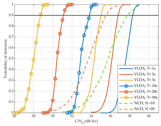 - High probability of detection. As long as the C/N0 is greater than a threshold, the VLDA method can successfully acquire signals with 100% probability. As a comparison, the performance of NCH method is related to the initial phase of ranging code and the secondary code, which might lead to acquisition failure, even at high C/N0.