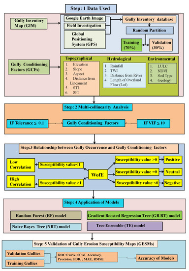 The present study was carried out in the following five main steps (Figure 2): (1) Gully inventory map (GIM) and GCFs data layers were prepared; (2) a multi-collinearity analysis was carried out to select the gully erosion conditioning factors (GCFs); (3) the weight-of-evidence (WofE) method was used to examine the relationship between gully erosion and GCFs; (4) the machine learning models RF, NBT, GBRT, and TE models were applied to prepare the GESMs, and (5) the performance of each of the ensemble models was evaluated using the area under the receiver operating characteristic (AUROC) and SCAI methods and a few statistical measures.