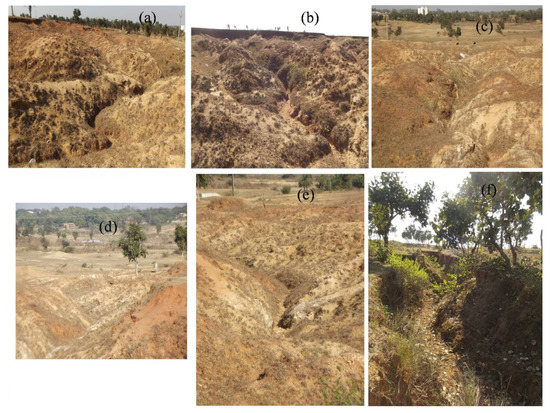 Field photographs of gullies of fallow land and vegetation-covered areas (a) Charakmara (24°00′36″ N, 86°54′48″ E), (b) Dhainghati (23°57′56″ N, 87°00′34″ E), (c) Agaia (23°57′15″ N, 87°10′14″ E), (d) Bamombhuin (23°56′41″ N, 87°12′07″ E), (e) Hesaltanr (23°56′13″ N, 87°07′31″ E), (f) Prasadpur (23°57′03″ N, 87°12′36″ E)