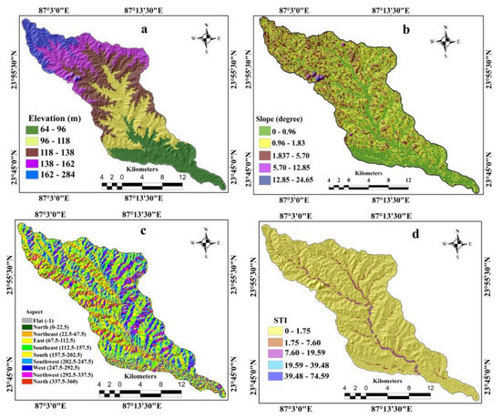 The digital elevation model (DEM), collected from USGS, was used as the elevation data layer (Figure 4a). The altitude of the study area was categorized into five classes, namely 64 m–96 m, 96 m–118 m, 118 m–138 m, 138 m–162 m, 162 m–284 m (Figure 4a). The slope affects gully erosion significantly [26]. The slope map was prepared in GIS from a recorded DEM (Figure 4b) and was classified into the five classes of 0–0.96, 0.96–1.83, 1.83–5.70, 5.70–12.85, 12.85–24.65 (Figure 4b). Like the slope map, the aspect map was derived from the DEM (Figure 4c) and divided into nine subgroups: flat (−1), north (0–22.5, 337.5–360), north-east (22.5–67.5), east (67.5–112.5), south-east (112.5–157.5), south (157.5–202.5), south-west (202.5–247.5), west (247.5–292.5), north-west (292.5–337.5) (Figure 4c). The sediment transportation index (STI) was calculated using Equation (Equation (1)) suggested by Moore and Burch [38], and it was also derived from the DEM.