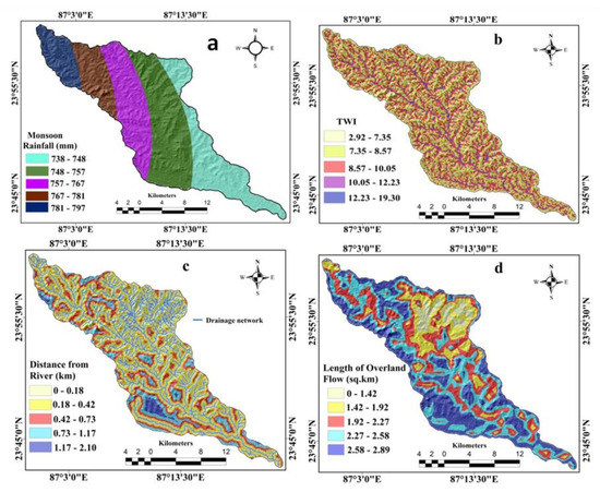 Hydrological factors: (a) monsoonal rainfall, (b) topographical wetness index (TWI), (c) distance to river, (d) length of overland flow (Lof).
