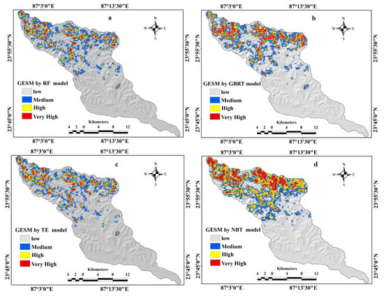 The gully erosion models were built using ensemble machine learning algorithm-based training datasets to predict the spatial susceptibility to gully erosion. The gully erosion susceptibility (GES) indices produced by the machine learning techniques RF, GBRT, NBTree, and TE have been classified into four classes with respect to gully erosion susceptibility, namely low, medium, high, and very high, based on the natural break classification method. The Figure 7a–d show the GESMs produced by the four ensemble machine learning frameworks.