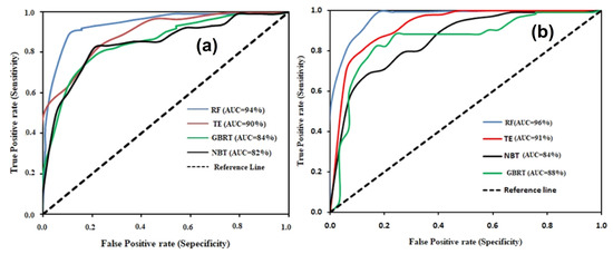 ROC curves showing AUC of RF, GBRT, TE, and NBT models (a) training dataset and (b) validation dataset.