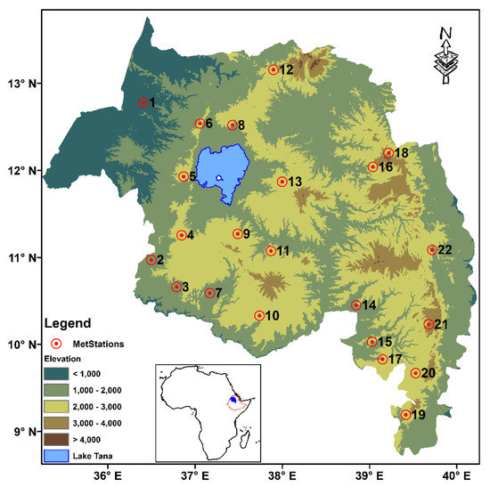 The study area encompassed 22 meteorological stations distributed throughout the Amhara Region of Ethiopia (Figure 1). Elevation in the region varies from 500 m at the northwestern border with Sudan to more than 4000 m mainly in the Semen (Northern) Mountain Ranges (Table 1). The highest peak in the Semen Mountains peaks is Ras Dejen, which has a height of 4620 m. Mean annual rainfall, which varies from 500 mm to 2000 mm, is highest in the southwestern part of the region, and generally decreases to the east. Rainfall is highly seasonal, with the heaviest rains falling from June through September, and dry conditions occurring from October through February. Average annual air temperature ranges from 27 °C at the lowest elevations to 16 °C in the highlands.