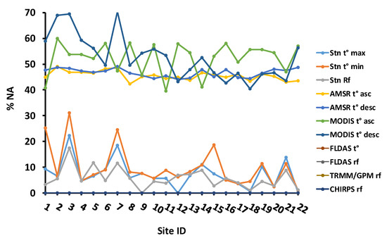 Percentage of daily missing data (% NA) of temperature and rainfall for 2003–2016. Note that Site ID in this figure corresponds to station labels in Figure 1 and Table 2. Note also that station, AMSR, and MODIS temperature are measured daytime and nighttime while the rest of the variables are daily. Note that the % NA values are zero at all sites for FLDAS, Tropical Rainfall Measurement Mission/Global Precipitation Mission (TRMM/GPM), and CHIRPS.