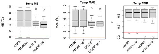 The MODIS LST data has many missing values during the rainy and cloudy season in this part of the world. To decide whether to use interpolation methods to impute the remaining mission values that are available in the MODIS and AMSR average daily variables that were not filled by the retrospective moving average smoothing procedure, we compared the non-imputed and imputed datasets. The imputed time series data (particularly the MODIS dataset) showed smaller ME, MAE, and better r with the in situ time-series data (Figure 3). Thus, we decided to impute the missing values in the MODIS and AMSR satellite datasets for our study. The advantage of the imputation is not only improving the quality of the data, but most importantly, there will be available data for every time period of the data (daily in our case), so as to facilitate basic research as well as operational applications.