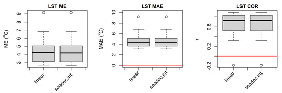 Daily MODIS LST comparative accuracy statistics box plots from two missing data imputation methods (linear and seasonal decomposition with interpolation algorithm) for 22 meteorological stations in the Amhara Region, Ethiopia for 2003–2016.