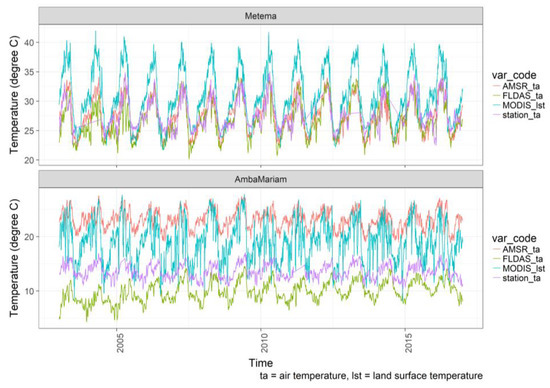 Time series plot of temperature from remote sensing satellite (AMSR air temperature (ta) and MODIS LST), interpolated (FLDAS ta), and meteorological station (station ta) datasets at a lowland (Metema), and highland (Amba Mariam) stations, Northwest Ethiopia, for 2003–2016. Note the y-axis scale difference.