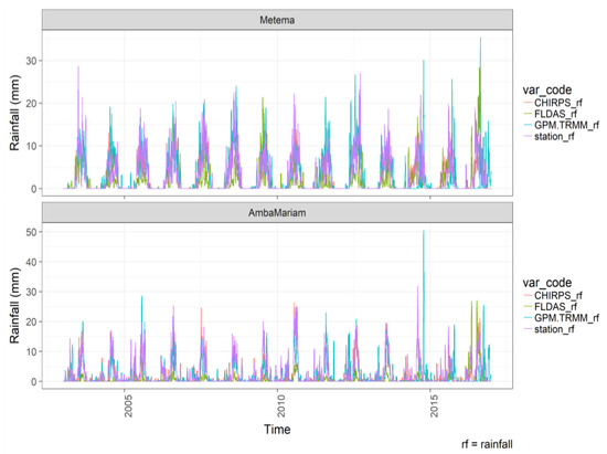 Time series plot of rainfall from remote sensing satellite (GPM.TRMM_rf), model driven (CHIRPS_rf, FLDAS_rf), and meteorological station (stations_rf) datasets at a lowland (Metema), and highland (Amba Mariam) stations, Northwest Ethiopia, for 2003–2016. Note the y-axis scale difference.
