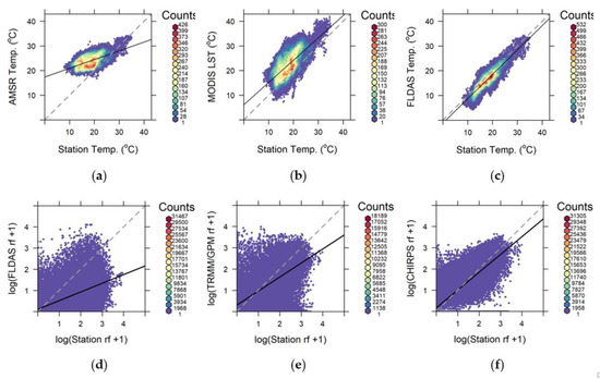 Binned scatter plots of temperature (a–c) and rainfall (d–f) from satellite/interpolated and station datasets. The light gray diagonal dashed lines are 1:1 lines, while the solid-black lines are fitted linear regression lines. Note the color variation of the hexagons. Each hexagon holds one or more number of data points, with red-highest and purple-lowest number of points. Note also the convergence/divergence of the linear regression line from the 1:1 diagonal line.