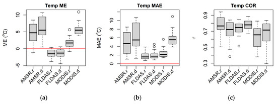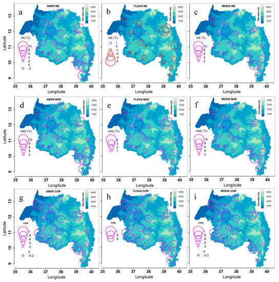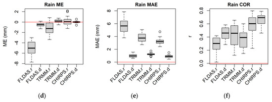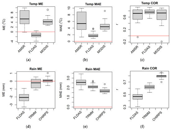 The FLDAS temperature showed the lowest bias (ME ≈ 1–3 °C; Figure 9a), and error (MAE ≈ 1–3 °C; Figure 9b) and the strongest correlation with the day-to-day variability of station temperature (COR ≈ 0.7–0.8; Figure 9c). In contrast, AMSR temperature showed a larger bias (ME ≈ 3–9 °C; Figure 9a), and error (MAE ≈ 3–9 °C; Figure 9b), and lower agreement (COR ≈ 0.5–0.8; Figure 9c). CHIRPS rainfall showed the least bias and error (ME ≈ −0.2–0.2 mm, MAE ≈ 0.5–2 mm; Figure 9d and e respectively), and the best agreement (COR ≈ 0.8; Figure 9f), with the station rainfall data. FLDAS rainfall displayed larger bias and error (ME ≈ −1.5–−2.5 mm, MAE ≈ 1.5–2 mm; Figure 9d and e respectively), and lower agreement (COR ≈ 0.4–0.5; Figure 9f).