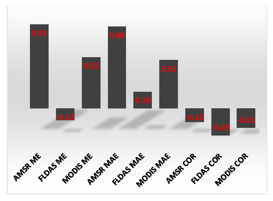Both ME and MAE of AMSR and MODIS temperature were larger during the dry season than the rainy season (Figure 14a,b). Dry season MODIS and FLDAS temperature data correlation with corresponding station data were higher in the rainy season compared to the dry season, while AMSR data showed the reverse (Figure 14c). Land-surface temperature and near surface air temperature measure different aspects of the environment [45]. Seasonality of similarities and differences of these two temperatures depends on the seasonal dynamics of the Bowen ratio [46]. The Bowen ratio is the ratio of the sensible heat flux to latent heat flux. During the rainy season, much of the sensible heat flux is consumed for evapotranspiration, which in turn increases the latent heat flux. There is a lower Bowen ratio during rainy season, as sensible heat flux become lower and latent heat flux become higher [30,32,45,46]. LST and air temperature tend to equilibrate in the rainy season due to low sensible heat flux.