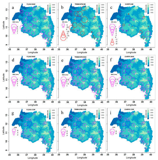Pixel-level satellite/interpolated daily rainfall data accuracy statistics spatial distribution for 22 meteorological stations in Amhara Region, Ethiopia for 2003–2016. Note the legend scale differences.