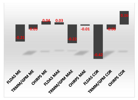 In the dry season, all FLDAS, TRMM/GPM, and CHIRPS rainfall data ME and MAE values were lower compared to those of the rainy season records (Figure 14d,e). Dry season FLDAS and CHIRPS rainfall data showed higher correlation with corresponding station rainfall data compared to the rainy season records, while rainy season TRMM/GPM rainfall showed higher correlation than the dry season data (Figure 14f). The station and remotely sensed rainfall data all had lower values during the dry season, which could contribute to the lower error values than in the rainy season when rainfall amounts are high and there is more potential for satellite and interpolated measurements to deviate from the station measurements.