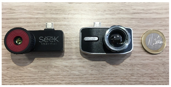 The Flir camera was discarded because of its small detector area, while the Opgal camera was not considered due to its higher cost, which was roughly double the other models. A Seek Thermal CompactPRO (ST) and two units of Thermal Expert TE-Q1 Plus (TE-Q1) cameras (see Figure 1) were chosen and characterized.