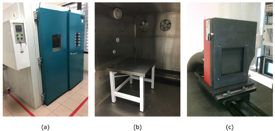 Laboratory facilities: (a) Dycometal WALK-IN MOD entrance door; (b) Workbench inside the climatic chamber; (c) DCN1000-L3 laboratory blackbody.