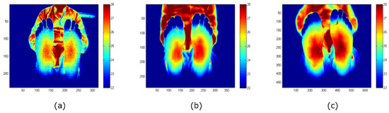 Feet images acquired with each camera: (a) ST; (b) TE-Q1; (c) INO IRXCAM-640. NU correction was applied to all the images to offer a clearer image. The images are color-coded indicating the temperature measurements in Celsius degrees (°C). The x- and y-axes represent the number of pixels of each sensor.