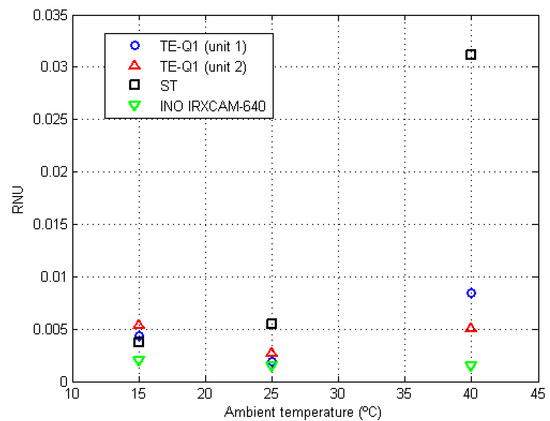 The residual errors at room temperatures of 15 °C and 40 °C are listed in Table 7. These values, for the TE-Q1 and ST cameras, increased as compared to the values observed at 25 °C, whereas they remained relatively constant for the INO IRXCAM-640 camera. For clarification purposes, Figure 5 shows RNU variations for each tested camera at different selected ambient temperatures. Furthermore, as previously reported at 25 °C, the RNU values for the TE-Q1 cameras differed notably between units. Since they were not purchased at the same time, it might be plausible that they proceed from a different fabrication batch.