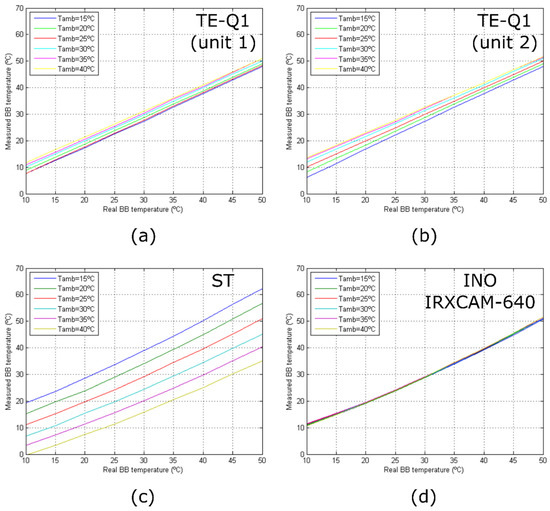 Figure 6 also illustrates that only the measured responses of the TE-Q1 cameras behave linearly with temperature. This might be due to the manufacturer’s internal calibration of the microbolometer, which assumes a linear response with the sensor irradiance, as described by Planck’s law, although not with the temperature. On the other hand, the ST and INO IRXCAM-640 cameras provided raw data, and thus the manufacturer’s preprocessed step was not included. For simplicity, linearity was considered but a proper calibration is required.