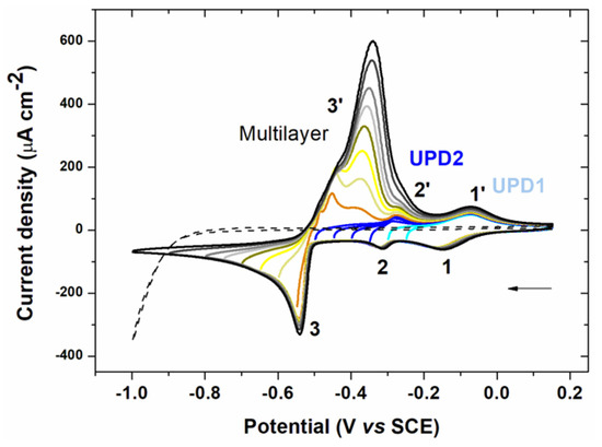 The onset potential corresponding to the oxidation of lead was around −0.2 V/SCE, which corresponded to the potential of UPD1 in Figure 2. However, the presence of two plateaus or peaks was observed, which can be explained by a difference in crystallography of the electrode material or lateral interactions between the atoms [21,28].