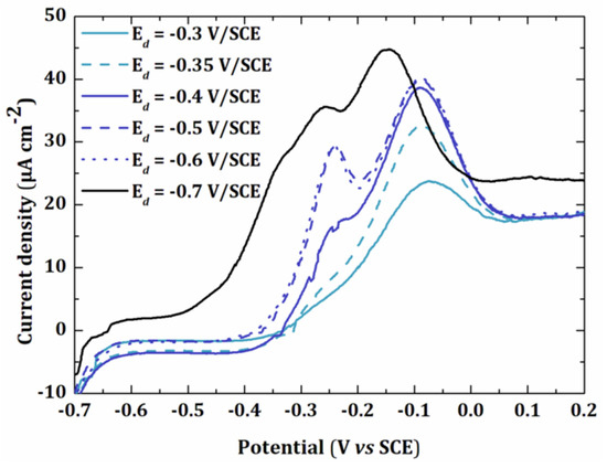 The peak current increased when the electrodeposition potential was more negative. A first peak was observed at −0.075 V/SCE. The presence of a shoulder at −0.25 V/SCE for Ed = −0.35 V/SCE showed the appearance of a second peak, which was clearly visible when Ed = −0.5 V/SCE. Finally, a third peak appeared for Ed = −0.7 V/SCE. This peak probably corresponded to the multilayer deposition of lead since it occurred at −0.53 V/SCE under these conditions (Figure 2). It has been shown that each new peak only appears when the first peak has reached its maximum intensity, even though the potential is negative enough for the formation of several peaks [29]. In this work, to avoid multilayer deposition of lead, we used a deposition potential of −0.5 V/SCE.