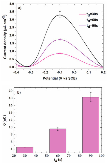 Figure 4a shows the anodic redissolution peaks obtained in linear voltammetry with different electrodeposition times td.