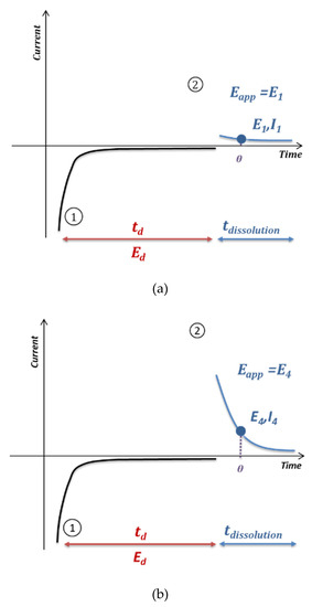This experiment was repeated three times and the average obtained is shown in Figure 9, for two different values of θ: 0.005 s and 0.007 s. In Figure 9a,b, the currents obtained for the three selected potentials were close to those of the I-E curves of Figure 7.