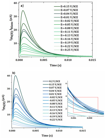 Chronoamperograms obtained by applying different potentials at the electrode array (gold electrodes 0.002 cm2) after an electrodeposition step at −0.5 V/SCE for 90 s of a solution of 15 µmol L−1 of lead chloride in 0.1 mol L−1 NaCl. The blank corresponds to the same analysis performed in a solution without lead. (a) Electrochemical signal of lead minus the blank (b) Electrochemical signal of lead.