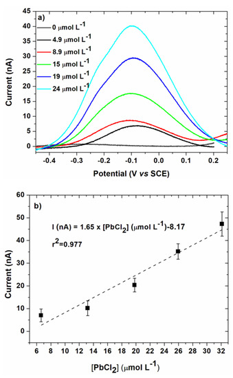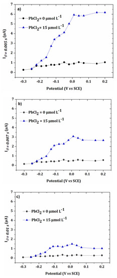 The variation of the current was higher in the presence of lead compared with the blank, with current values about seven times higher than in the absence of lead (Figure 6a,b).