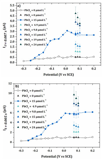 I-E curves obtained for the blank and 15 µmol L−1 PbCl2 in 0.1 mol L−1 NaCl. Values of current for applied potentials of 0.07 V/SCE, 0.085 V/SCE and 0.1 V/SCE for PbCl2 concentrations ranging from 15 µmol L−1 to 24 µmol L−1 (error bars are based on 3 repetitions) and for the blank (error bars are based on 5 repetitions). (a) = 0.005 s and (b) = 0.007 s.