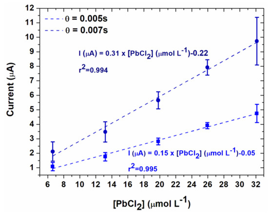For highest concentrations of lead, the current decreased when the potential increased, probably due to the higher kinetics of the oxidation reaction. Therefore, the calibration curves were plotted from the current values obtained at 0.07 V/SCE. These calibration curves for the two different sample times are given in Figure 10. The limit of quantification was determined from the following equation [32]: