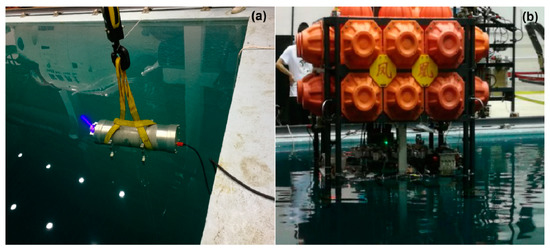 Real-time in situ detection with an LIF instrument. (a) The LIF instrument works in the pool and (b) The LIF instrument is carried on the Phoenix underwater work platform.