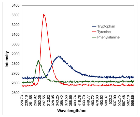 As the aromatic amino acids were excited by the UV laser (266 nm), the positions of their fluorescence peaks varied for differentiation [37]. After being excited, the fluorescence intensity was proportional to the concentration of the aromatic amino acid under the given conditions, and was therefore used to quantify the concentrations [38].