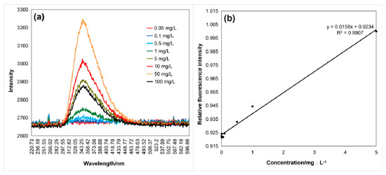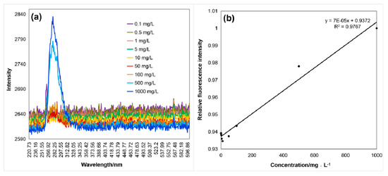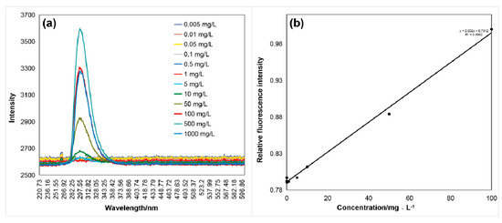 As shown in Figure 5, Figure 6 and Figure 7, the fluorescence intensity linearly increased with the aromatic amino acid concentration with the excitation by the 266 nm UV laser. Figure 5a, Figure 6a and Figure 7a show the raw data of spectra with the fluorescence peaks of different concentrations of the aromatic amino acids. The relationship between fluorescence intensity and concentration, after simple data processing, is shown in Figure 5b, Figure 6b and Figure 7b. The fluorescence peak data of the three aromatic amino acids were normalized to facilitate comparative analysis. The linear relationship between the concentration and normalized fluorescence intensity was retrieved, as follows: