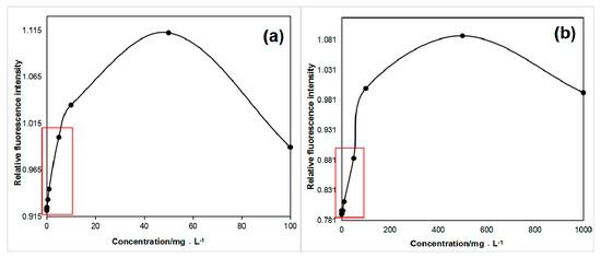 With the increased concentration of the aromatic amino acid solution, the fluorescence quantum yield of tryptophan and tyrosine first increased and then decreased (Figure 8) [46], and notable fluorescence quenching was observed [41,47]. The part marked with a red square in Figure 8a,b is shown in Figure 5b and Figure 6b. If the tryptophan concentration was greater than 10 mg/L, the above concentration fluorescence quenching effects occurred. However, tyrosine quenching effects were found above 150 mg/L, and no fluorescence quenching of phenylalanine was observed. Because fluorescence quenching rarely occurs in natural water, we did not discuss it in detail in the paper.