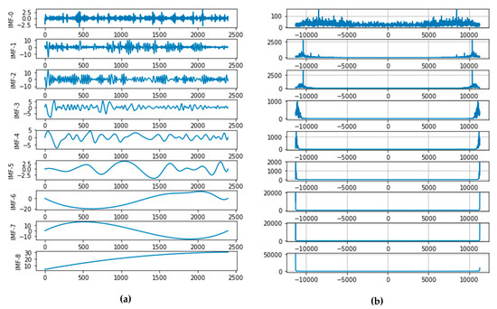 We take temperature data as an example to give the results of EMD decomposition. In Figure 2a, all the obtained IMFs are shown over time (from IMF-0 to IMF-8), and correspondingly each sub-picture on the right-hand side (b) is the frequency component. It can be found that each IMF has a specific time and frequency domain, and the frequency components contained in the IMF are reduced from top to bottom.