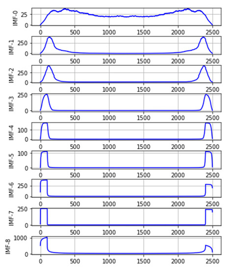 The results in Figure 4 show that IMF-0 contains a wider frequency band. In contrast, IMF-1 and IMF-2 are significantly reduced, but there are still long tails in the cutoff band. Differing from IMF-3 and IMF-4, the downhill is significantly steeper, indicating that fewer frequency components are included. Furthermore, for IMF-5–8, the downslope is almost vertical, and we find that the fluctuations of these components on the time domain map (Figure 2a) are relatively flat.