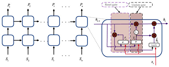 Using the known input and output data, the GRU is trained by the stochastic gradient descent algorithm and the optimal weight can be obtained. The GRU network was trained on the sum of IMF sequences in each group. The GRU network consisted of multiple GRU cells, and here the number of hidden layers is set as 2. Shown as Figure 6, , is the input of the GRU network and , is the output.