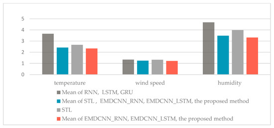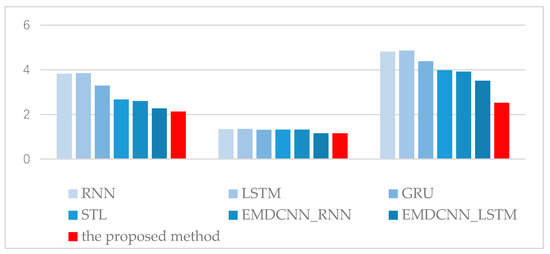 In Table 1, a comparison between the proposed method and RNN [49], LSTM [51], GRU [53], EMDCNN_RNN [49] (EMD and CNN-based RNN [49]), EMDCNN_LSTM [51] (EMD and CNN-based LSTM [51]), and STL [17] in terms of RMSE.