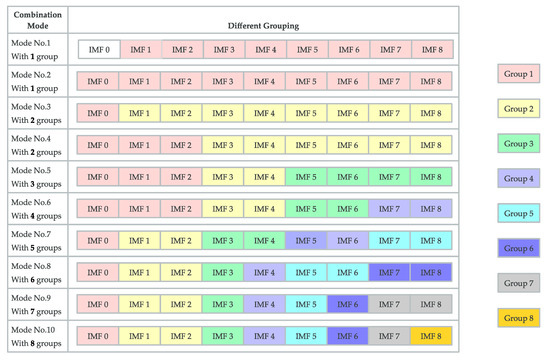 In this study, according to the frequency characteristics of IMFs, we combined all the IMFs into 3 groups, meaning the decomposition components with similar frequency characteristics will be labeled, grouped, and added together, then for each group, one model will be trained. Therefore, the number of models in each prediction interval will be fixed.