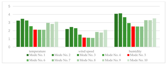 The data in Table 3 and Figure 11 can be interpreted as a large difference in performance across the different groups. For the temperature data, the RMSE of {IMF 1-8} in mode no. 1 is 6.56% lower than mode no. 2, which indicates that removing the first component (noise item) decomposed by EMD is helpful for prediction. The RMSE decreases from mode no. 2 to mode no. 7, but prediction increases in mode no. 8 and mode no. 10. We can note that the performance will be worse if the number of groups exceeds 5.