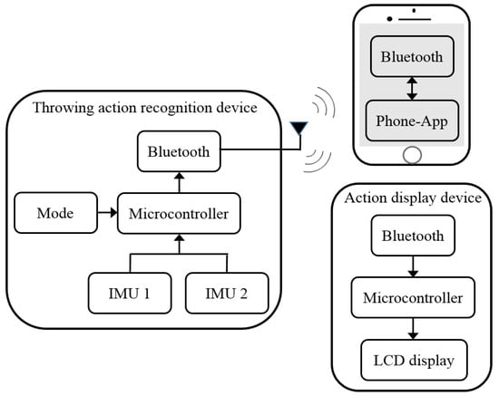 In this work, we have developed a real-time assist system for upper extremity throwing action and we have incorporated various hardware and software technologies as part of its development. Figure 1 depicts the hardware architecture of the developed real-time assist system. In the throwing action recognition device, the acceleration signals of the upper arm and forearm generated by throwing action are captured using two IMU sensors, respectively, as the primary step. We have used two high-precision MPU6050 inertial sensors as part of this work. The package size of MPU6050 is 4 mm × 4 mm × 0.9 mm, which is comparatively very small and also its energy consumption is very low. The IMU sensor comprises a three-axis gyroscope and a three-axis accelerometer. The function of the accelerometer of an IMU is adequate to perform action recognition in this work. For analysis, the acceleration signals captured using IMU sensors are sent to the microcontroller chip of the device. A Bluetooth module is incorporated in the action recognition device to transmit instructions to the action display device and mobile phone. Furthermore, a mode functionality is also provided in the action recognition device. Based on the analysis of the acceleration signal by the microcontroller chip of action recognition device, appropriate results are displayed on the liquid crystal display (LCD) panel of the assist system placed at the glove end. It is possible for the user to check the correctness of each phase of the throwing action at this stage by looking at the results displayed on the LCD panel. The resultant data from the microcontroller chip is further transmitted to the mobile phone interface also for the analysis of data statistics. In this way, the users are able to utilize the whole functionality of the proposed upper extremity throwing action assist system to achieve a complete system of learning, rehabilitation, and rectification.