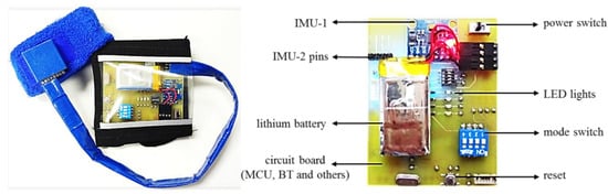 The proposed real-time assist system for upper extremity throwing action has two modes. Mode one and mode two represent the right hand and left-hand players, respectively. As our device is a wearable one, it is designed in a user-friendly manner to help the user to use it conveniently in the real-world. Moreover, the developed assist system is an alternative to conventional motion capture biomechanical gait laboratories. The wearing design of the device includes two sections: the forearm section and the upper arm section. As shown in Figure 2, the upper extremity throwing action assist device is made as a wrist wearable type, which can be conveniently worn and taken off. Furthermore, the device is lightweight and fits smoothly to the surface of the forearm and upper arm. It is also possible to adjust the size of the device so as to fit the different arm and wrist circumferences. The proposed throwing action assist system includes a rechargeable lithium battery, a miniaturized embedded system, and a device holster. The user can replace the battery in the future if it gets drained and also easily adjust the learning mode accordingly.